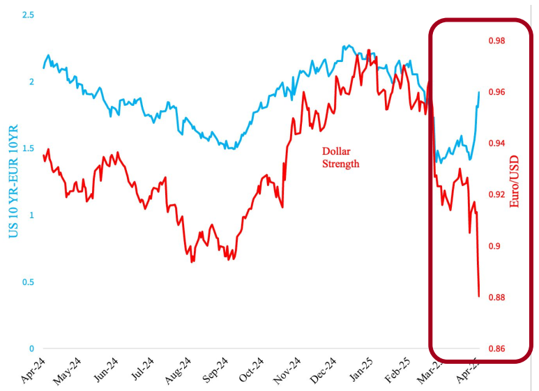 Figure 4: In April 2025, the dollar depreciated as yields increased, signalling a “flight from Treasurys”.